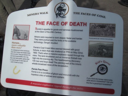 A metal sculpture of a miner plus Information panels that tell the story of significant players in coal mining in the area and describe the geology and natural and human history of the area’s coal mines.