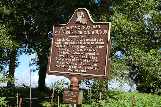 Shackleford is a ceremonial site with 4 mounds that date to about AD 800. Three of the mounds are 3 feet tall or less. However, the large platform mount is over 13 feet tall and is the best-preserved part of the site. It was constructed in several episodes on top of a prepared surface of sand.