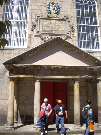 Under the Coat-of-Arms of 'Their Majesties (T.M.) William and Mary' a plaque reads: IN 1688 KING JAMES VII ORDAINED THAT THE MORTIFICATION OF THOS. MOODIE GRANTED IN 1649 TO BUILD A CHURCH SHOULD BE APPLIED TO THE ERECTION OF THIS STRUCTURE